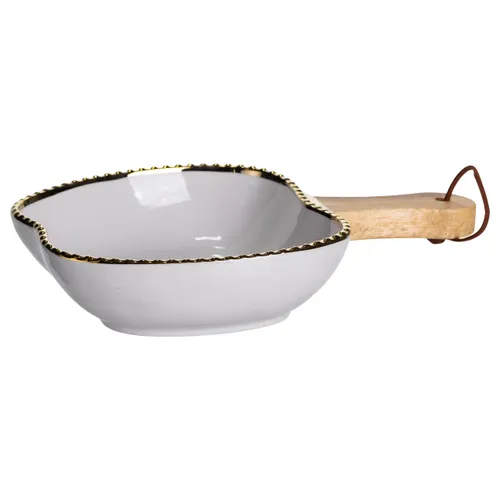 Об'єм 400 мл дозволяє подати порцію оптимального розміру, а наявність дерев’яної ручки полегшує транспортування і знижує ризик опіків при перенесенні гарячих страв. Фігурна форма вигідно виділятиме подані страви і прикрашатиме сервірування.