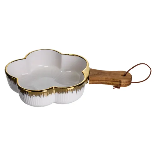 Тарілка глибока з зручною ручкою “Квітка” виготовлена з високоякісного порцеляни та доповнена дерев’яною ручкою, яка забезпечує надійний хват і комфорт при перенесенні. Розміри виробу 24×16×4 см і об’єм 450 мл роблять тарілку оптимальною для подачі різних страв, від гарячих до холодних, закусок, салатів і десертів.