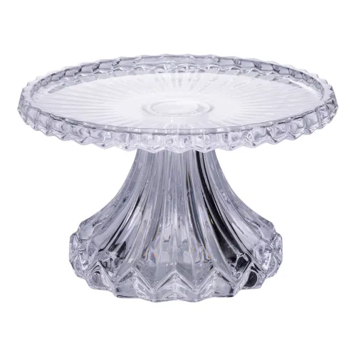 Ця модель вирізняється за рахунок поєднання традиційного круглого дизайну з витонченим рельєфним краєм і ніжкою, що повторює декоративний візерунок. Використання прозорого загартованого скла з імітацією кришталевого ефекту забезпечує високу міцність і привабливий зовнішній вигляд, який вигідно підкреслює красу десертів.