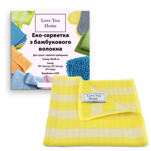 При виборі серветки зверніть увагу на її склад та розмір. Модель від LoveYouHome розміром 30х30 см оптимальна для комфортного використання і підходить для більшості побутових завдань. Поєднання бамбука і мікрофібри у складі гарантує м’якість та високу вбираність.