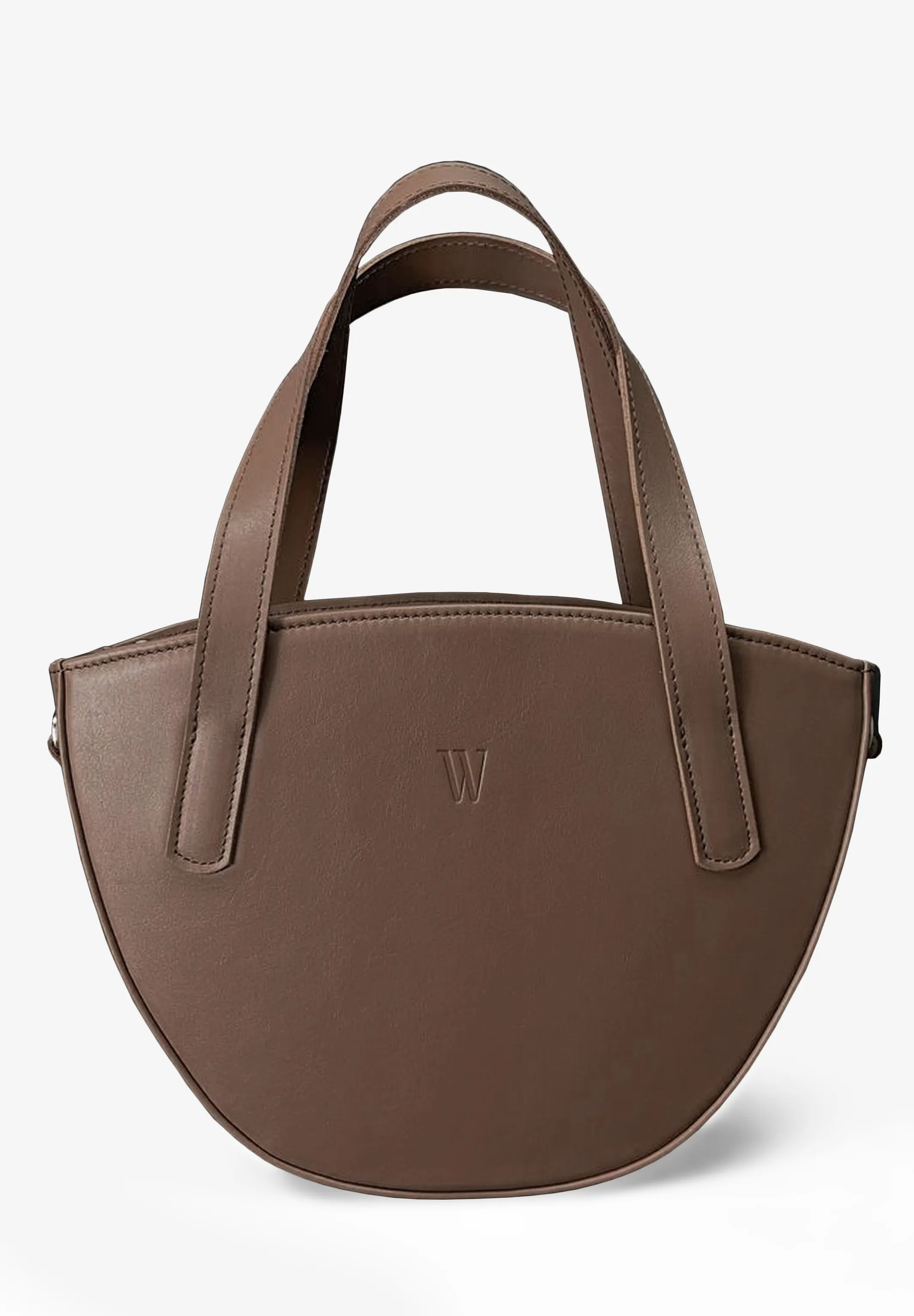 Форма сумки — напівкругла, з акуратними лініями, що надають їй елегантність та сучасний характер. Компактні розміри дозволяють носити її як на плечі, так і в руці, завдяки коротким ручкам та знімному довгому ремінцю, який присутній для додаткового комфорту при носінні через плече.