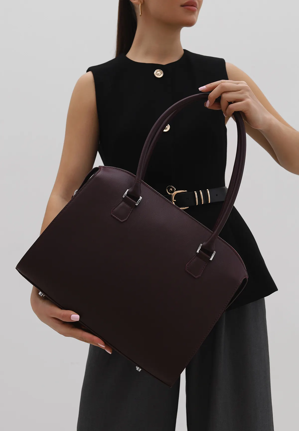 Сумка відрізняється компактними, але просторими розмірами — 37х31х10 см, при цьому висота ручок становить 23 см, що дозволяє комфортно носити виріб як у руці, так і на плечі. Виріб поєднує лаконічність та функціональність, підкреслюючи діловий стиль власниці, але чудово вписуючись і в повсякденні образи в стилі casual.