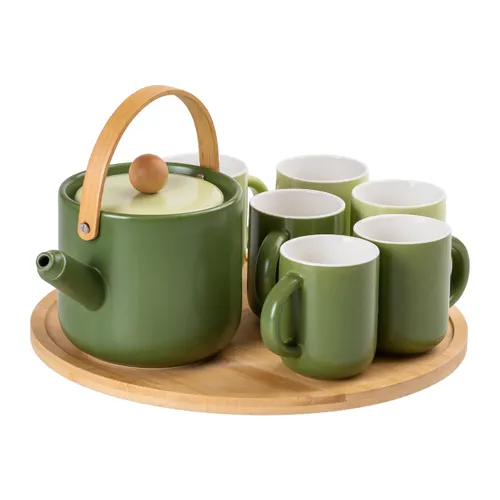 Дизайн набора выдержан в универсальном зеленом оттенке, благодаря чему он гармонично впишется в интерьер как классического, так и современного стиля. Качественный керамический материал и экологичность бамбука делают сервиз надежным и безопасным в использовании.