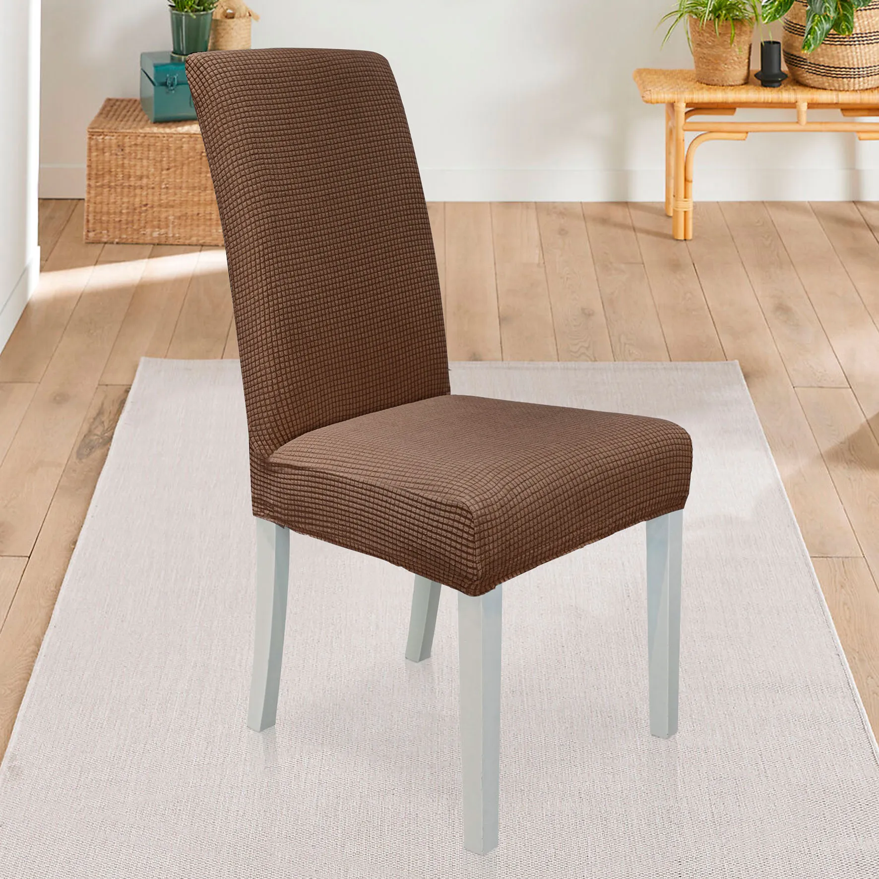 Чехлы на стулья – это отличный способ обновить интерьер без больших затрат. Коричневый цвет придаёт ощущение уюта и тепла, создавая домашнюю атмосферу.