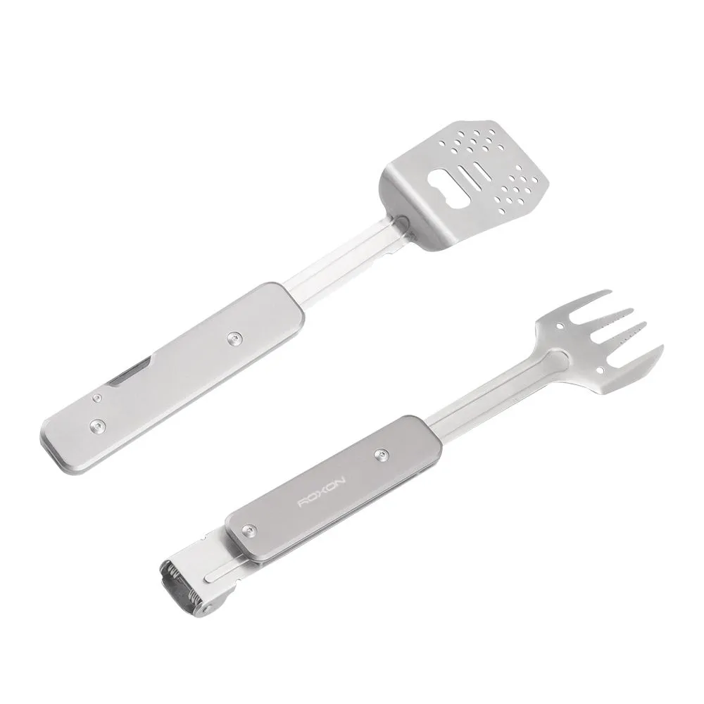 Модель S602 от бренда Roxon – это компактная версия мультитула для приготовления барбекю. Он состоит из металлических лопатки и вилки, которые могут использоваться в качестве самостоятельных инструментов, а вместе образуют удобные щипцы. Кроме того, в лопатку встроена открывалка для бутылок.