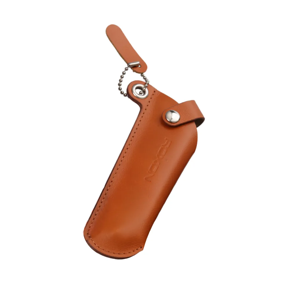 Нож фиксируется в чехле с помощью металлической кнопки, которая надежно удерживает инструмент внутри и не дает ему выпасть во время транспортировки. Размеры чехла составляют 142.5 x 60.9 x 8.7 миллиметров. В боковой части аксессуара имеется сквозное отверстие. У него можно продернуть темляк или кольцо с карабином, чтобы пристегнуть чехол к поясу или лямке рюкзака. Вес кожаного чехла составляет 13.4 грамма.