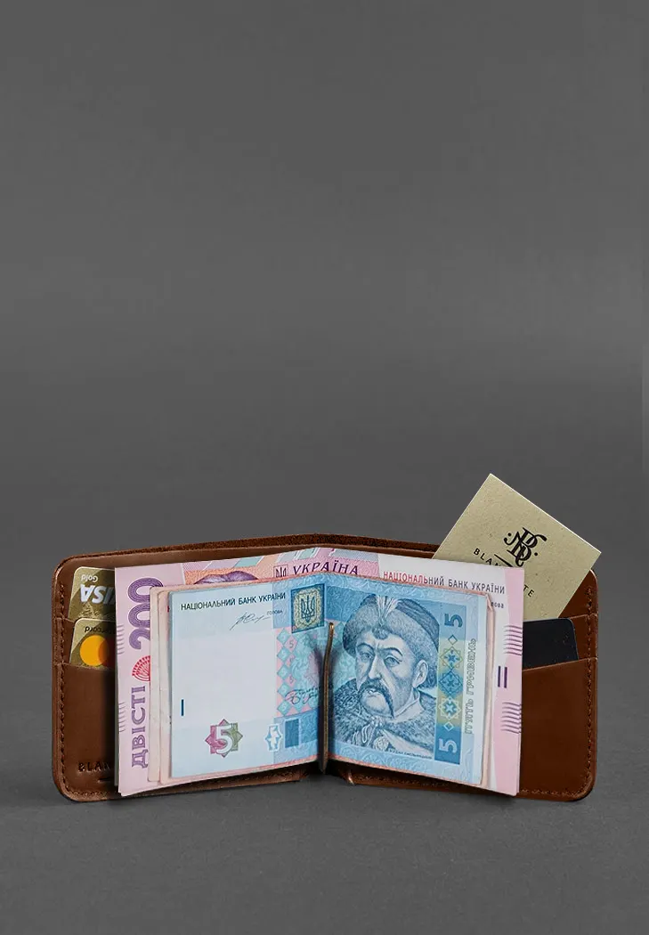 Кожаное портмоне 4.4 (с зажимом) светло-коричневое — отличный выбор для тех, кто ищет стильное и практичное решение для хранения кредитных карт и наличных денег. Изготовленный из высококачественной кожи, он обеспечивает продолжительность и элегантный внешний вид.