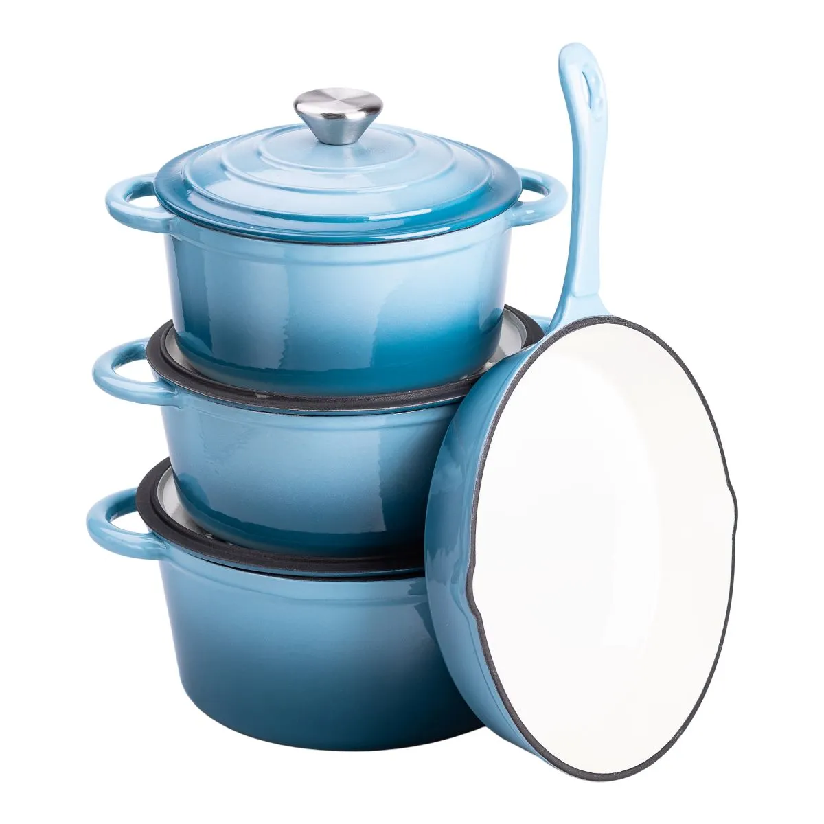 Набор чугунной посуды для приготовления 3 кастрюли и сковорода с эмалированным покрытием Голубой HP-1-7