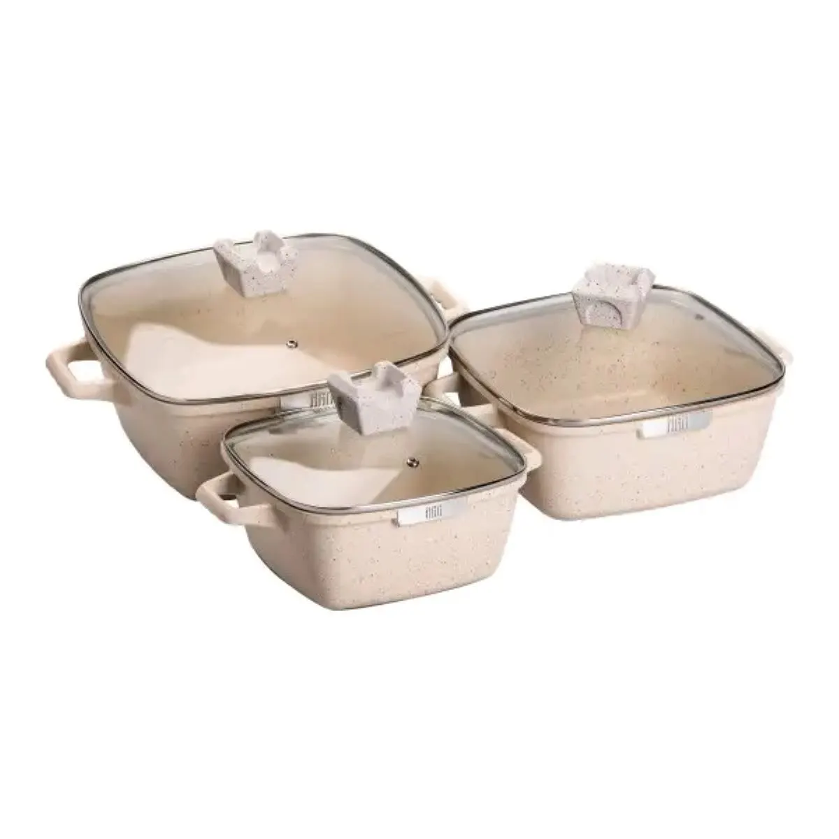 Набор из трех квадратных кастрюль диаметром 20, 24 и 28 см изготовлен из алюминия с толстым многослойным дном, что обеспечивает равномерное и быстрое распределение тепла по всей поверхности посуды. Каждая кастрюля оснащена жаропрочной стеклянной крышкой с пароотводом, позволяющей контролировать процесс приготовления без необходимости частого снятия крышки и потери тепла. Такой комплект отлично подходит для повседневного использования и приготовления разнообразных блюд домашней кухни.