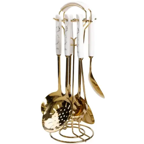 Набор кухонных принадлежностей 7 предметов на подставке столовые приборы из нержавейки Золото с белым HP-20-7 — это тщательно продуманный комплект, который сочетает в себе надежность материалов и эргономичный дизайн. Он предназначен для выполнения разнообразных кухонных задач: от перемешивания ингредиентов до подачи готовых блюд. Благодаря разнообразию изделий в наборе, пользователь получает универсальный инструмент для ежедневной готовки.