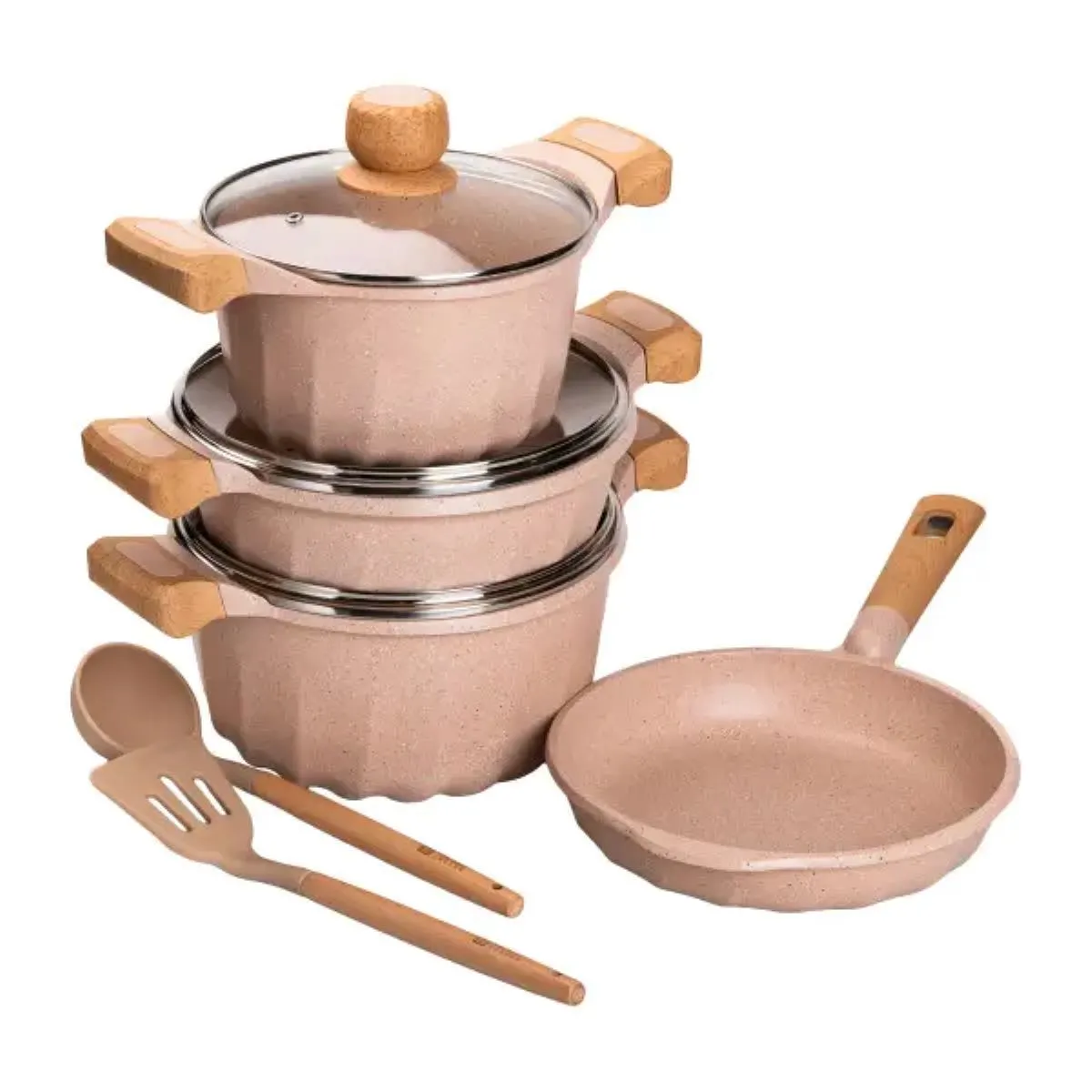 Характеристики "Набор посуды, 3 кастрюли, сковорода, алюминиевая толстодонная MGC с лопаткой и половником, бежевый HP-4-401CR"