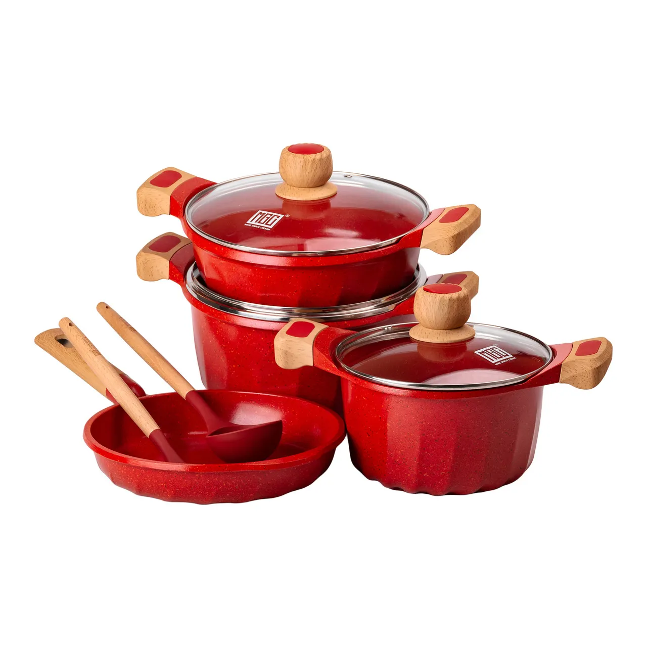 Красный цвет внешнего покрытия придает набору современный и привлекательный вид. В комплект входят силиконовая лопатка и половник, обеспечивающие комфорт во время готовки. Посуда идеальна для использования на всех типах плит, включая индукционные, электрические и газовые.