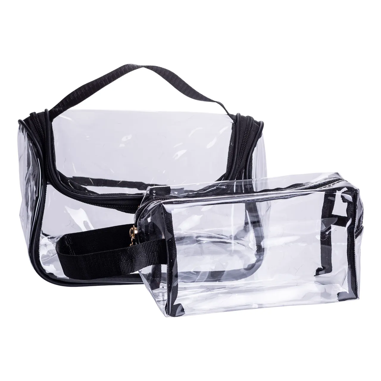 Набор из двух прозрачных косметичек представляет собой удобный и функциональный аксессуар для хранения косметики, средств гигиены и различных аксессуаров как дома, так и в поездках. Использование прозрачного материала ПВХ позволяет быстро определить содержимое каждой косметички без необходимости долго искать нужную вещь, что значительно экономит время и облегчает организацию.