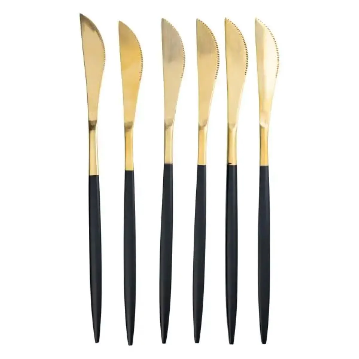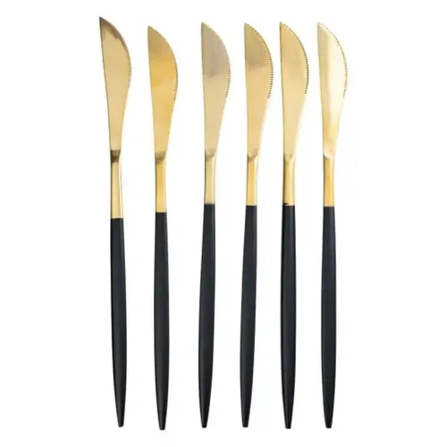Набор столовых ножей 6 штук ножи сервировочные столовые 22.5 см Черный с золотом HP-20-6 — это практичное и стильное решение для кухни, сочетающее в себе высокое качество материалов, эргономичный дизайн и удобство использования. Его универсальность, долговечность и эстетические достоинства делают его выгодным приобретением как для домашних пользователей, так и для профессионалов в сфере общественного питания.