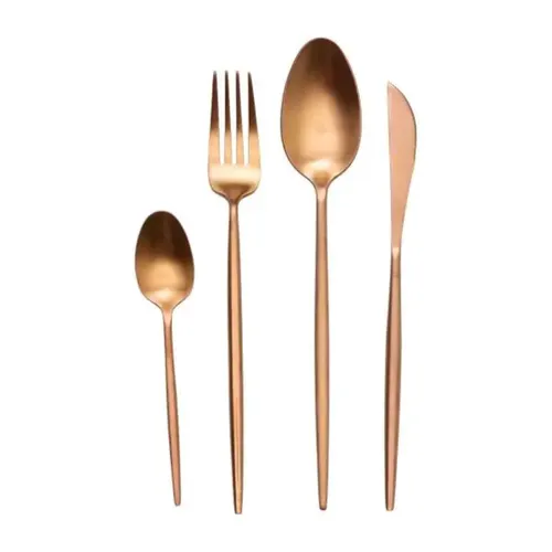 Набор столовых приборов золотистого цвета состоит из 24 предметов: 6 столовых ложек, 6 чайных ложек, 6 вилок и 6 столовых ножей. Каждый предмет обладает классическим дизайном без излишних декоративных деталей, что делает их универсальными как для ежедневного применения, так и для оформления праздничного стола. Все приборы имеют гладкую матовую поверхность, обеспечивающую легкость очистки и препятствующую задержке загрязнений.