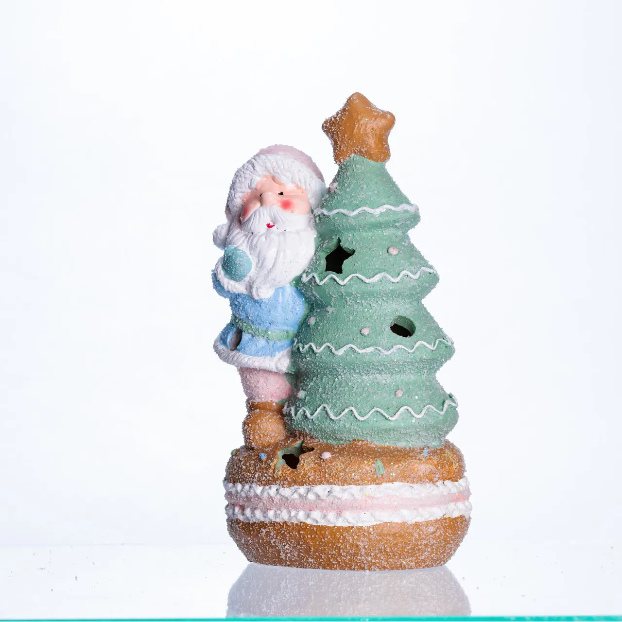 Основной персонаж фигурки – добродушный Санта-Клаус с румяными щеками и гущеющей белой бородой, который выглядывает из-за ёлочки. Ёлка окрашена в светло-зеленый цвет и украшена тонкими белыми гирляндами, дополненными золотистой звездой на верхушке, которая служит главным декоративным акцентом композиции.