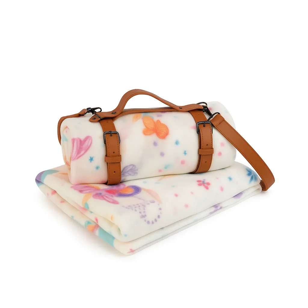 Дополнительный ремень с ручкой обеспечивает надежное крепление и экономит место при хранении. Поверхность флиса приятна на ощупь, не вызывает аллергических реакций и быстро сохнет после стирки. Плед можно использовать как одеяло, накидку на кресло или дополнение к интерьеру спальни или гостиной.