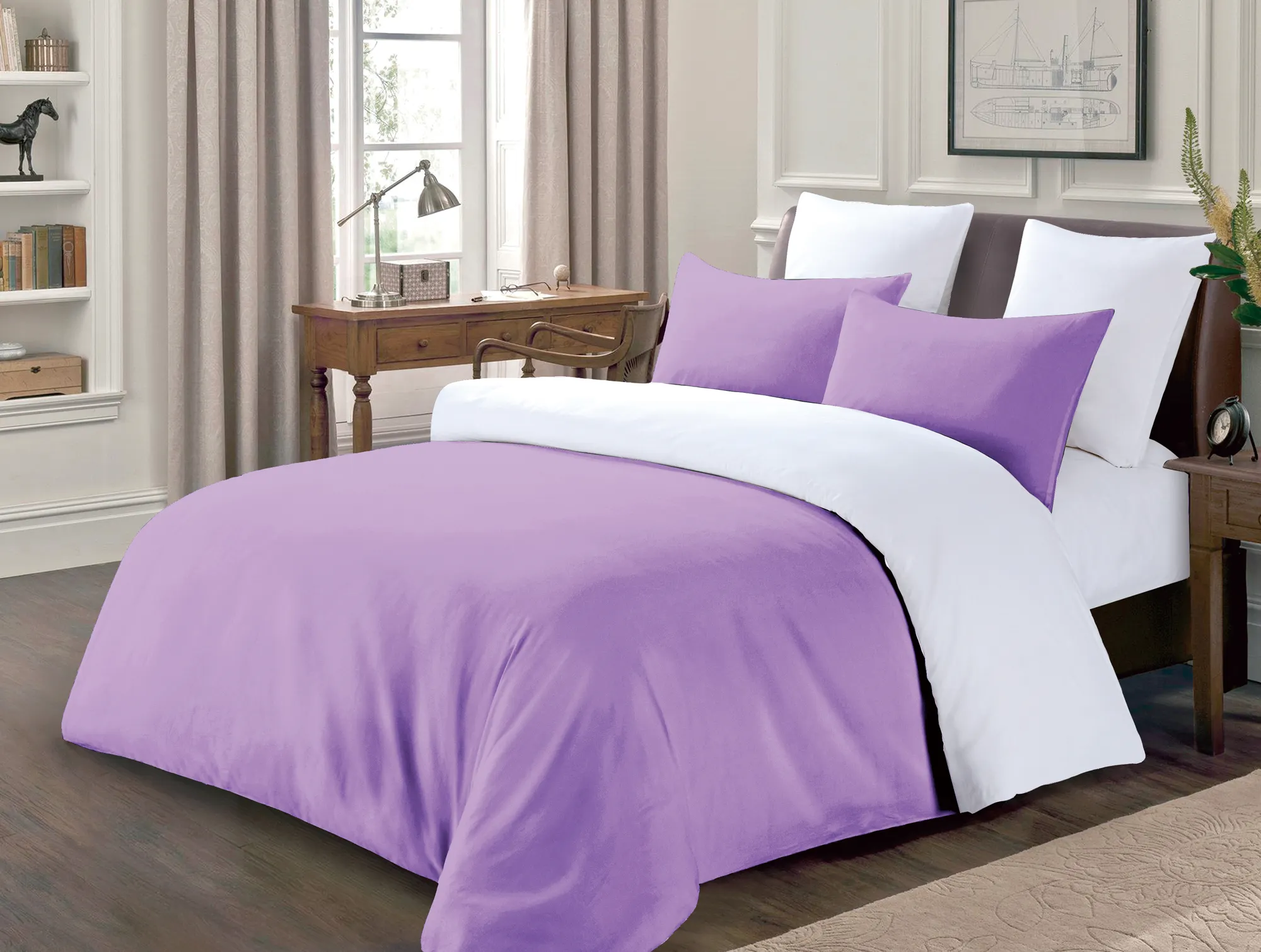 Цветовая гамма комплекта позволяет комбинировать его с различными аксессуарами и декором. Белый и фиолетовый цвета предоставляют возможность использовать дополнительный текстиль, например, пледы или покрывала, для создания уютной и индивидуальной атмосферы.