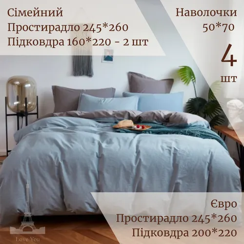 Характеристики "Постельное белье Love You Вареный хлопок Голубой + Серый двусторонняя Евро"
