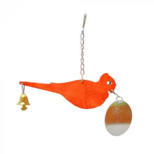 Подвеска в клетку для попугаев создана из безопасных для птиц материалов. Изготовлена из натурального дерева и отделана колокольчиком и зеркальцем, что делает ее еще более интересной забавкой. Подвешивается в клетке с помощью металлического крючка, который надежно, но подвижно, фиксирует конструкцию.
