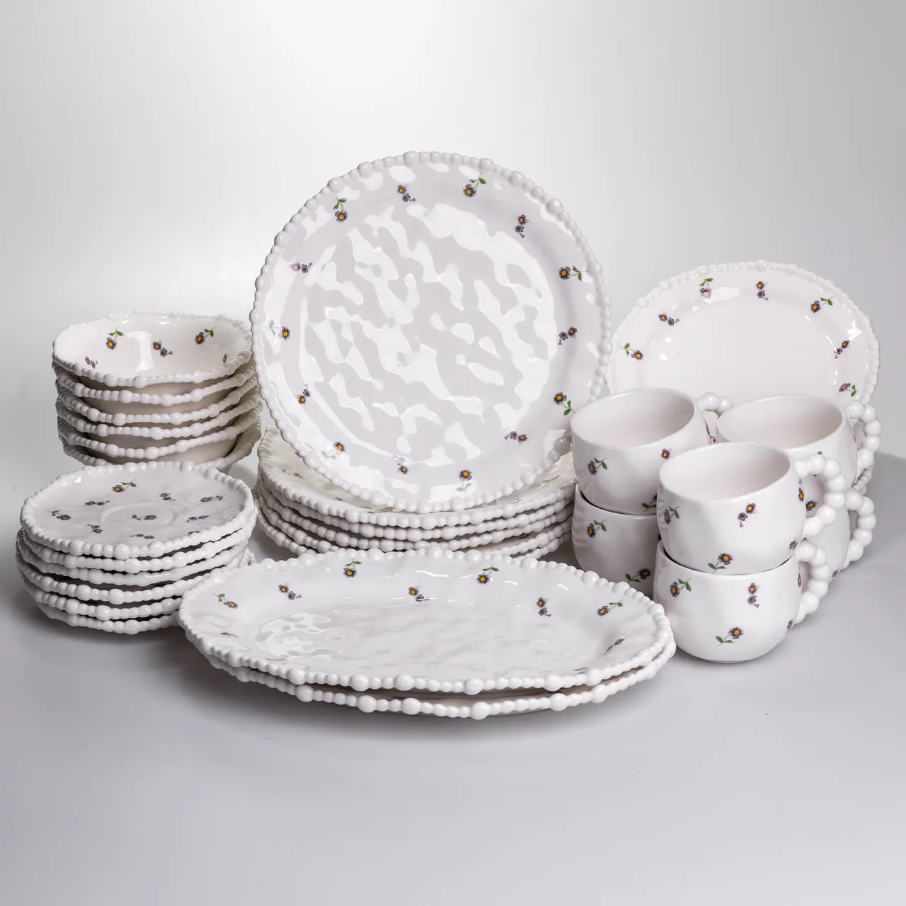 В комплект входят следующие изделия: 6 крупных обеденных тарелок диаметром 26 см, 6 десертных тарелок диаметром 21 см, 6 глубоких суповых тарелок с объемом 500 мл и диаметром 17 см, 6 чайных чашек по 300 мл, 6 блюдец диаметром 14,5 см и 2 больших овальных сервировочных блюда размером 36х20 см. Все элементы выполнены в круглой или овальной форме с фигурным краем, украшенным рельефом в виде жемчужин, что создано для эстетичного и функционального использования.