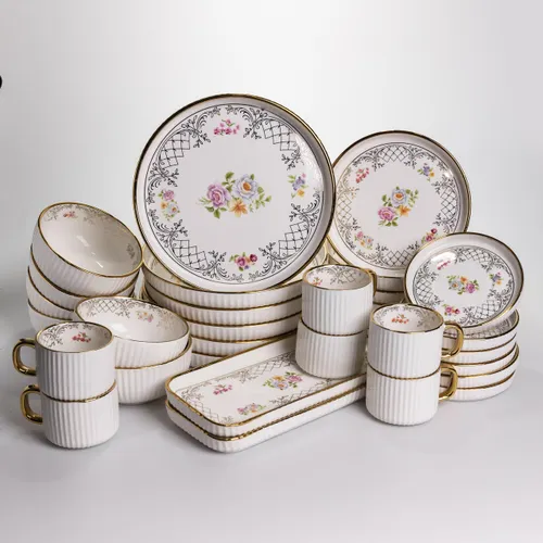 В комплект набора входят обеденные и десертные тарелки, глубокие пиалы, чайные пары с чашками и блюдцами, а также два больших сервировочных блюда для разнообразных блюд. Общая комплектация включает 32 предмета, охватывающих все основные потребности сервировки. Этот фарфоровый сервиз отличается долговечностью и практичностью, сохраняя презентабельный внешний вид на протяжении многих лет использования.
