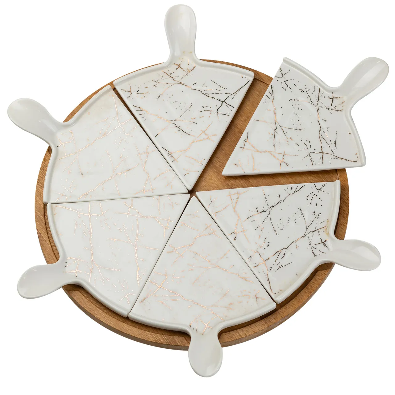 Набор состоит из одной вращающейся бамбуковой подставки и шести керамических секционных тарелок, что позволяет эффективно разделить и подать различные виды пиццы или других блюд, например, пироги и торты. Это отличное решение для семейного или праздничного стола, когда требуется разнообразие и презентабельность подачи.