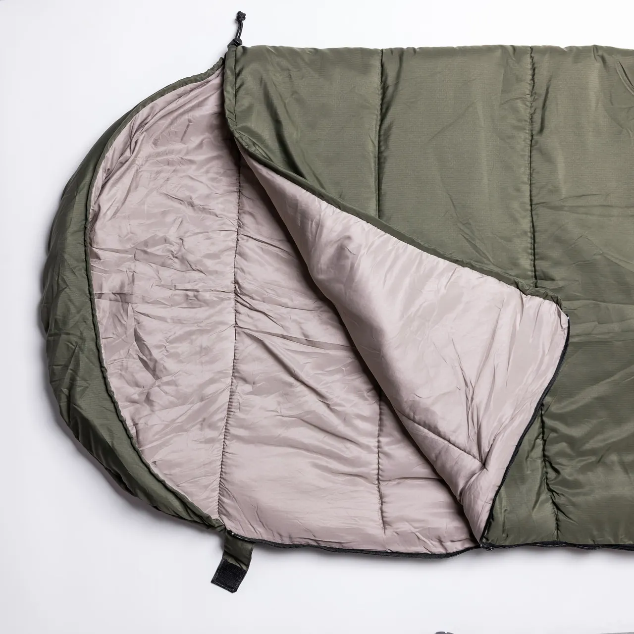 Спальный мешок выполнен в темно-оливковом цвете, что делает его неприхотливым в уходе и устойчивым к загрязнениям, часто возникающим в полевых условиях. Его конструкция позволяет использовать изделие не только для сна, но и как удобное одеяло или подстилку, что значительно расширяет возможности применения.