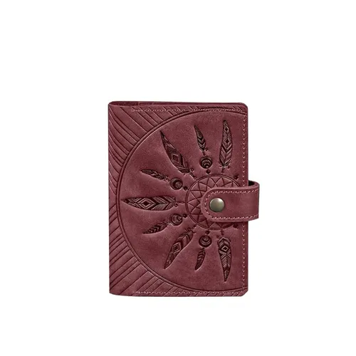 Женский кожаный переплет для паспорта 3.0 Инди бордовый отличается оригинальностью и высоким качеством исполнения. Это изделие выполнено вручную в мастерской BlankNote из натуральной кожи Crazy Horse, что обеспечивает долговечность и стильный внешний вид аксессуара. Стоит отметить, что кожаная поверхность обладает уникальной фактурой с эффектом матовости и изящным тиснением в виде ловца снов, которое придает изделию индивидуальность и дополнительную привлекательность.
